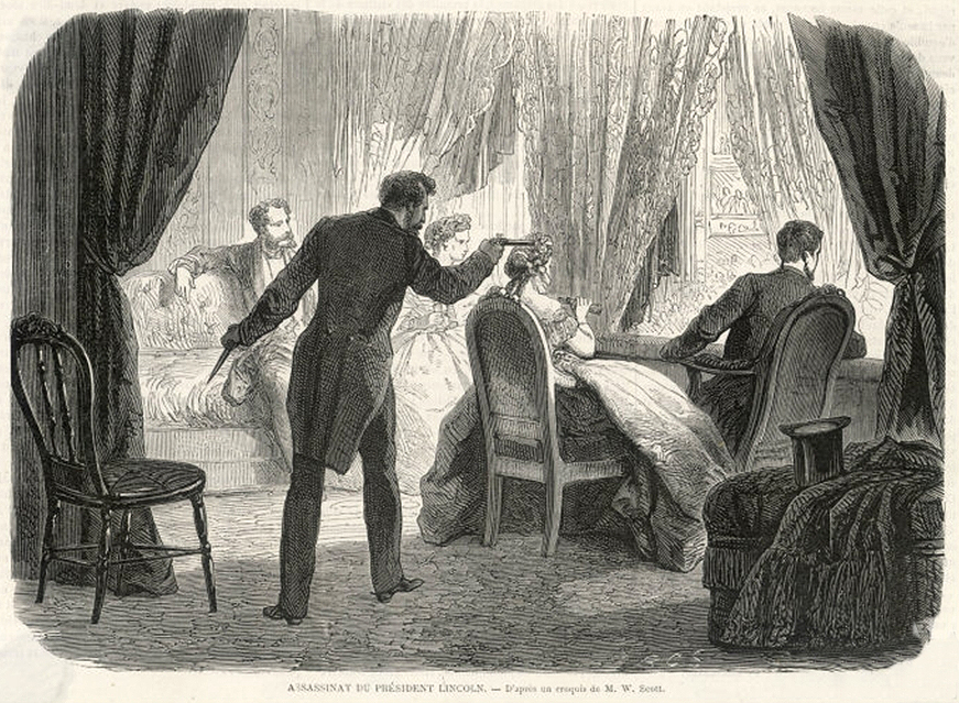 Drawing of John Wilkes Booth sneaking up on President Lincoln in his box at Ford’s Theatre. Image Source: French newspaper, L’illustration, May of 1865