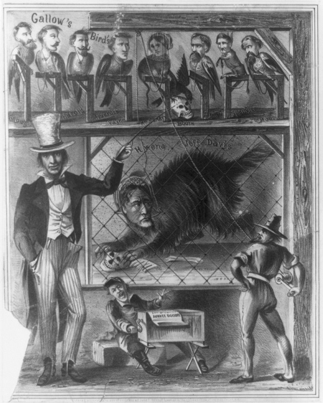 A political cartoon drawn during the conspiracy trial showing the conspirators and Jefferson Davis as animals waiting for the gallows. Booth is represented by a skull due to the fact he was already dead. All the conspirators are birds except Mary Surratt who is a rat, and Edman Spangler who appears to be an ass. The likenesses to the conspirators are not very good