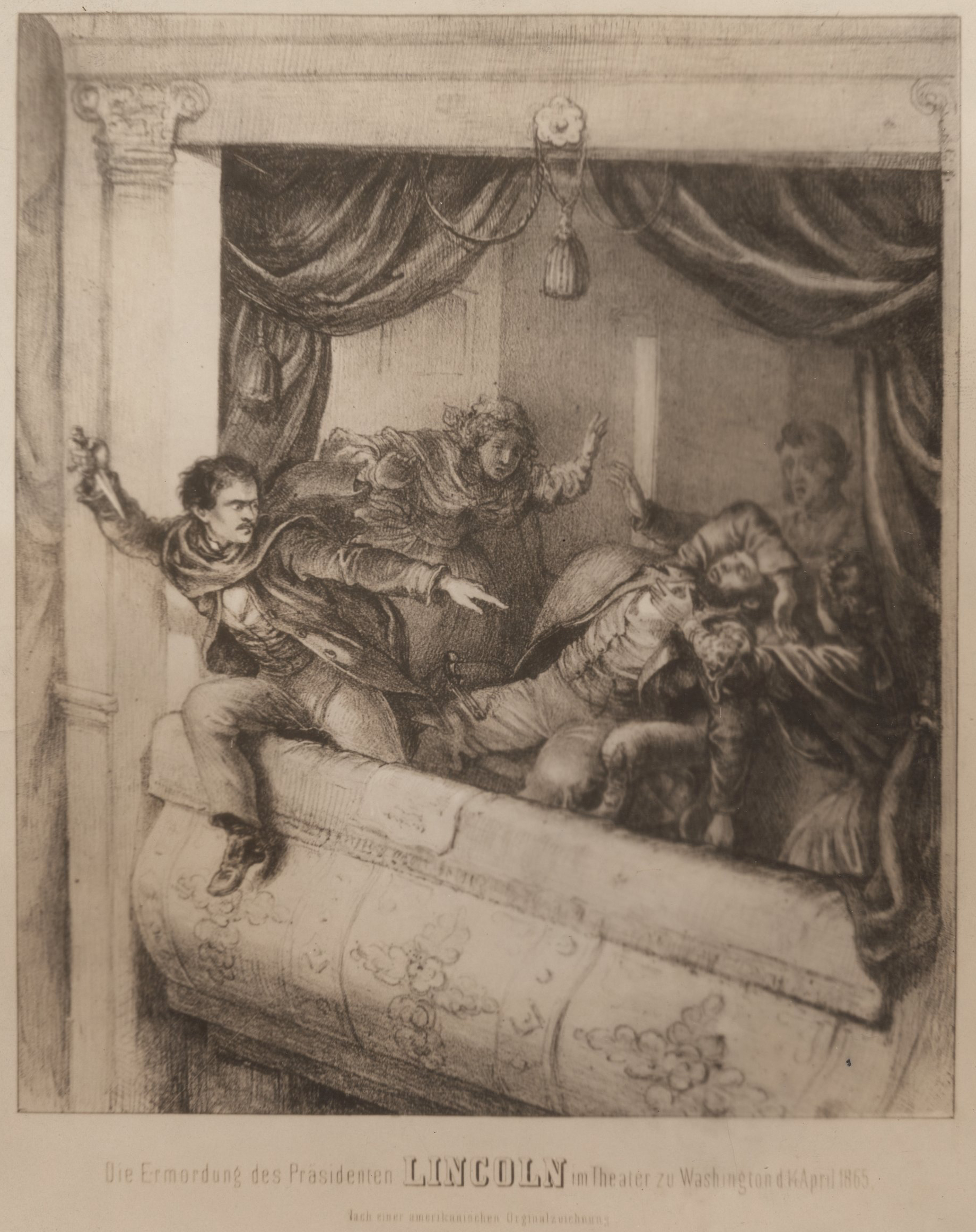 John Wilkes Booth’s leap from the president’s box to the stage after shooting Lincoln. Image Source: Brown University