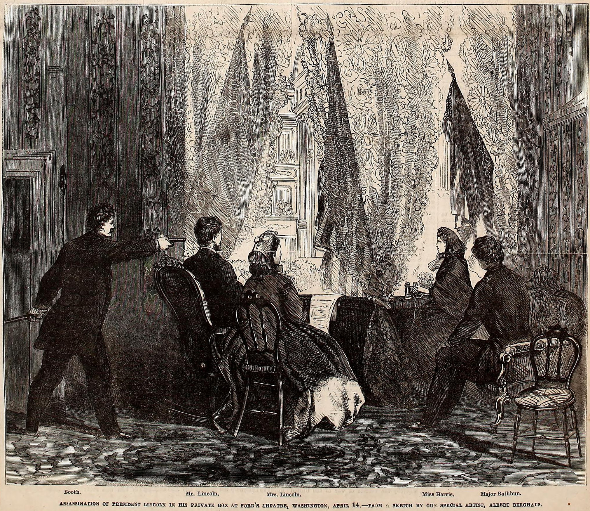 John Wilkes Booth assassinating President Abraham Lincoln in his box at Ford’s Theatre on April 14th, 1865. Image Source: Frank Leslie’s