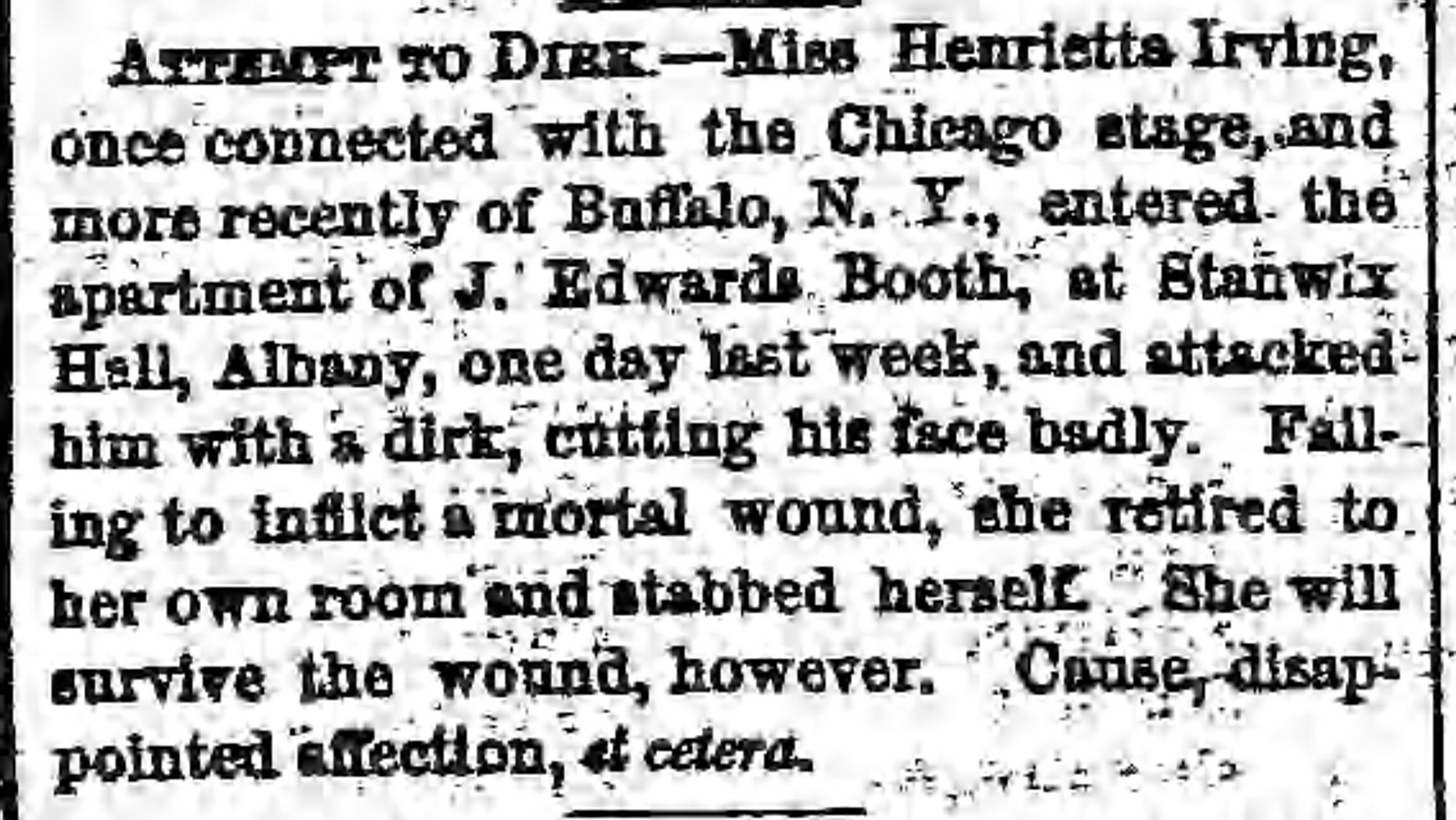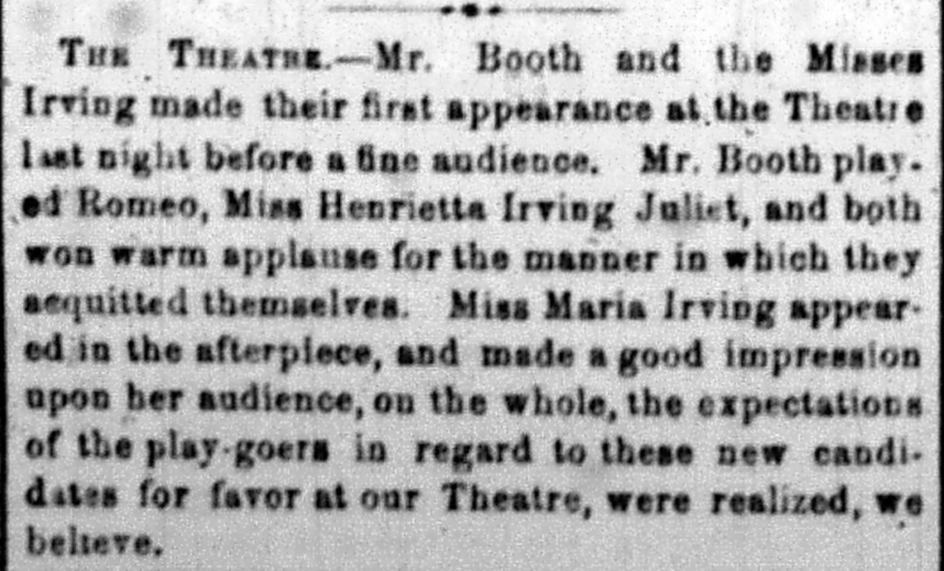 The event in question happened on October 12, 1860, during Booth’s ill-fated debut season that would end with him being stabbed by Henrietta Irving. A concise version of what occurred can be read in this newspaper article.