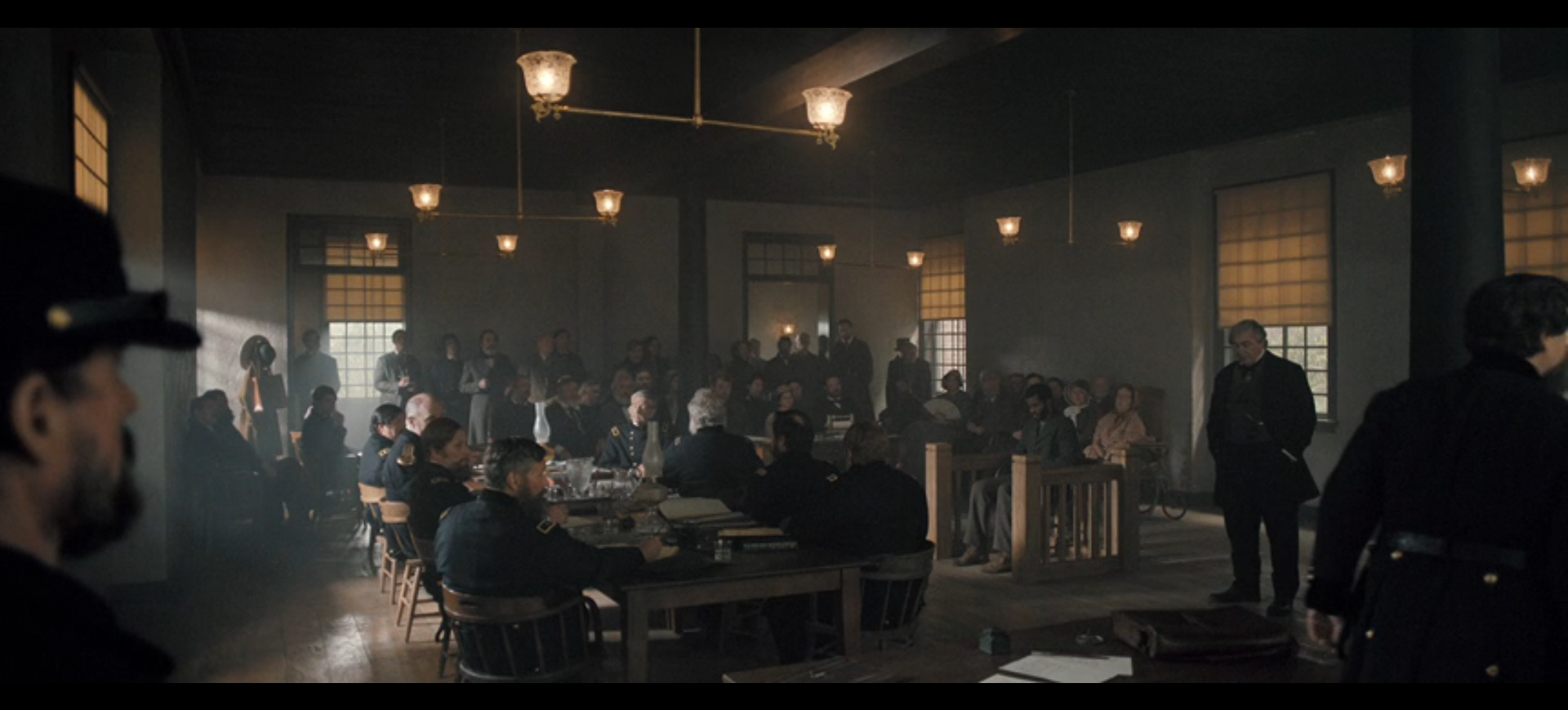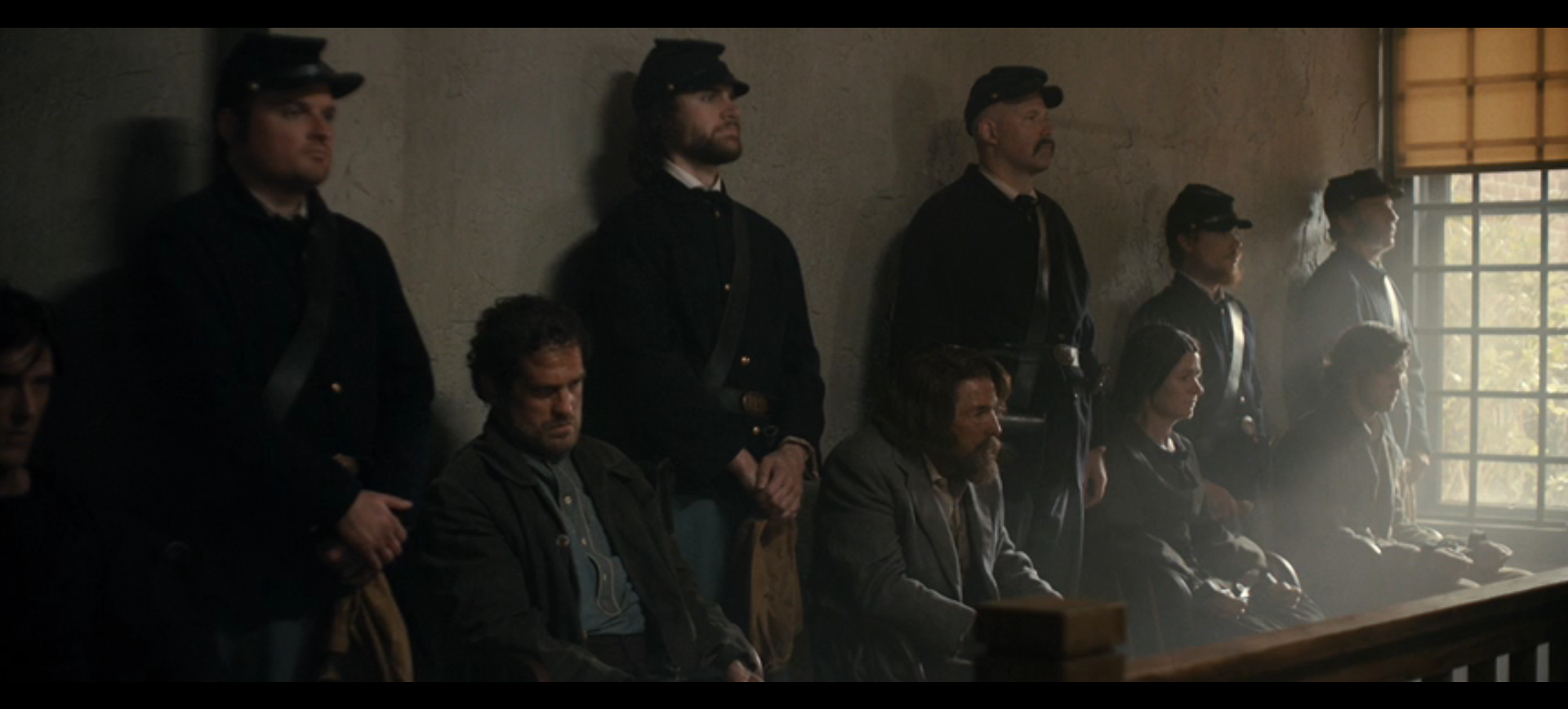 We then flash forward to the first day of the trial of the conspirators. Stanton talks with reporters outside before seating himself to watch the proceedings. Judge Advocate General Joseph Holt lays out the charges against the conspirators who are seated on a bench in the front of the courtroom. When Holt announces that the government is also charging Jefferson Davis in Lincoln’s assassination, audible gasps and rumblings are heard throughout the courtroom.