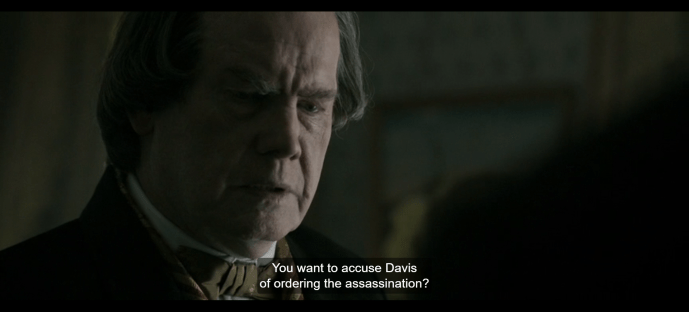 Next, we see Stanton talking to Jefferson Davis in his prison cell. The Confederate president denies any involvement in Lincoln’s death and is defiant that the cause of the Confederacy will live on.