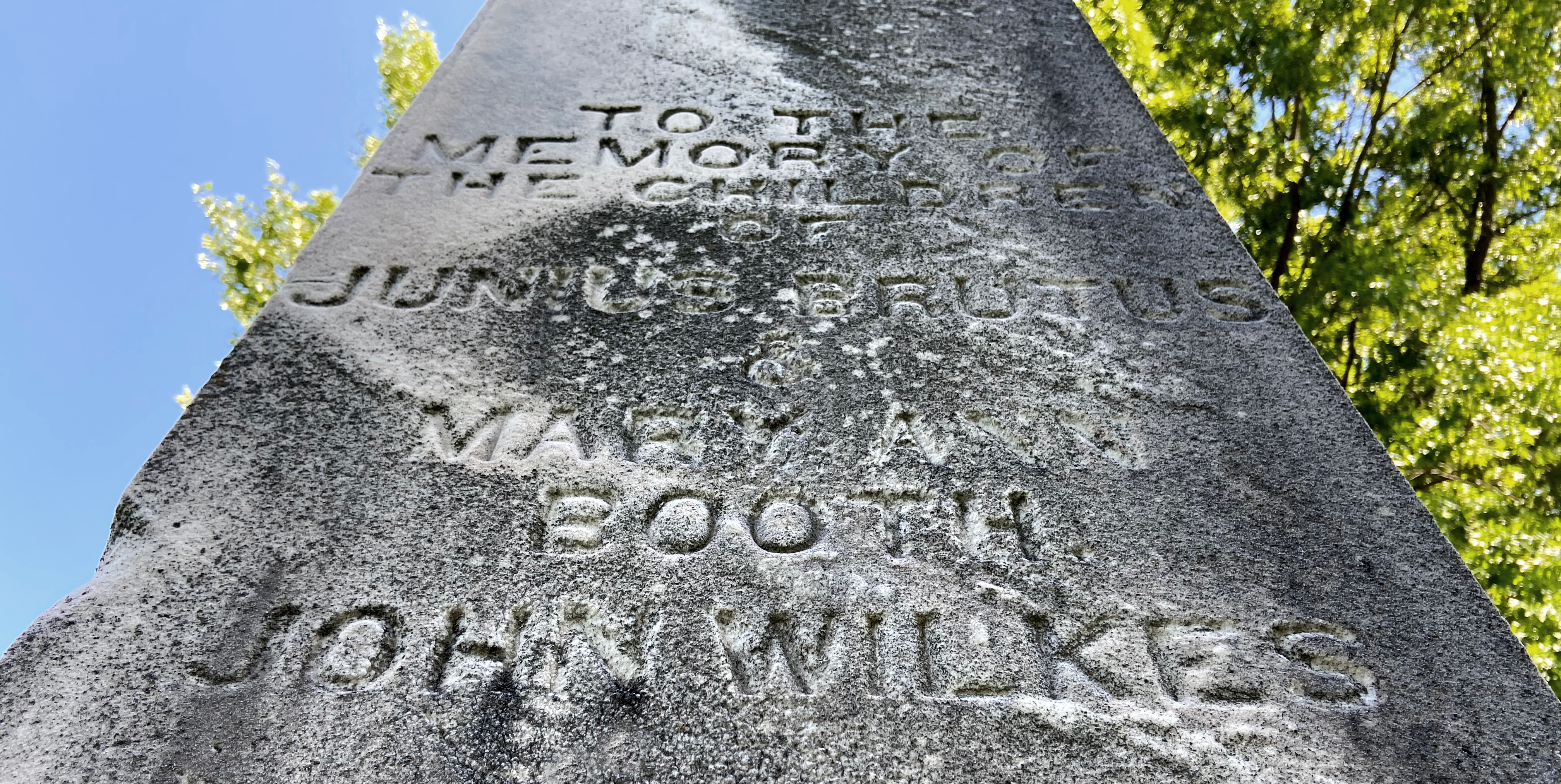 In reality, Booth’s body was never condemned to a watery grave. After an autopsy was performed, his body was placed in a boat and rowed to the grounds of the Old Arsenal Penitentiary, the same place where the conspirators would shortly be imprisoned and tried. Booth’s remains were buried under the floor of a storeroom. Edwin Stanton, himself, kept the key to this storeroom. In 1867, that part of the old building was slated to be demolished, so Stanton sent the key and men over to move Booth’s remains. Booth was buried in a different warehouse on the grounds, in a common grave in which David Herold, Mary Surratt, Lewis Powell, and George Atzerodt were also reburied. During the final days of Andrew Johnson’s presidency in 1869, the lame-duck president authorized the removal of the bodies and turned Booth over to his family. They transported him to Baltimore and buried him in the family plot at Green Mount Cemetery. While John Wilkes Booth does not have his own headstone in the plot, his name does appear on the back of the Booth obelisk, noting him as a child of Junius Brutus and Mary Ann Booth.