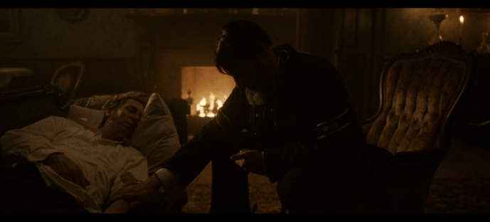 We then jump to Christmas Eve of 1869. It’s clear Stanton’s asthma has gotten worse over the intervening years as he inhales vapors through a medical device. Eddie Stanton brings news to his father that the elder statesman has been officially confirmed as a new justice of the Supreme Court. The younger Stanton is confident that, as a member of the Supreme Court, his father will continue to ensure Lincoln’s vision for the country and congratulates his father. Even in his weakened state, Stanton is noticeably pleased. After Eddie excuses himself, a teary-eyed Stanton looks out the window and announces, “We finish the work now. We have to.”