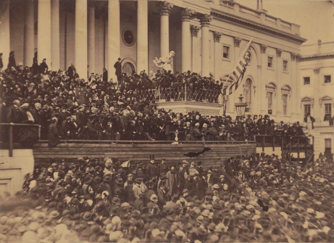 Noted photographer Alexander Gardner documented the scene of Lincoln’s second inauguration, much like he did four years earlier. Yet the circumstances were more difficult this time around. The day was mostly marked with overcast skies and drizzling rain. At some points, the sky would brighten and Gardner would attempt to photograph the scene. Yet, several of Gardner’s attempts resulted in less-than-ideal photographs of the President. Whether it was an incorrect focal length or issues developing the wet plate later, only a limited number of shots captured Lincoln well. As a result, you generally only see the image of Lincoln’s second inaugural that begins this post, as it was the best one that Gardner turned out (and even in that one, Lincoln is a bit blurry).