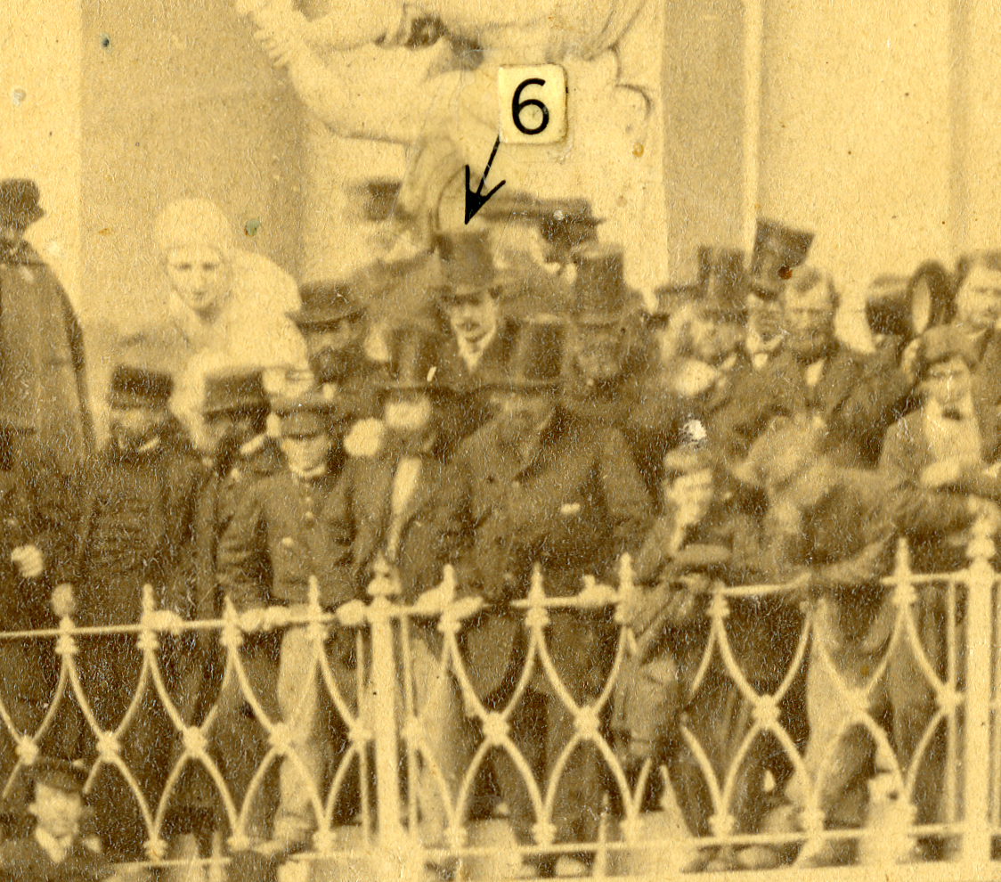 While many people have become aware of Booth’s possible inclusion in images of Abraham Lincoln’s second inaugural, most are unaware that multiple images of the event were taken and that there are differences between them. As a result, many look at the most famous image of the inauguration searching for Booth in the crowd. However, in the most prolific image of the inauguration, the one that begins this article, the man Meserved identified as Booth cannot be seen clearly. The figure is partially obscured by the gentlemen in front of him straining to hear. Only the figure’s hat and the top of his head are visible.
