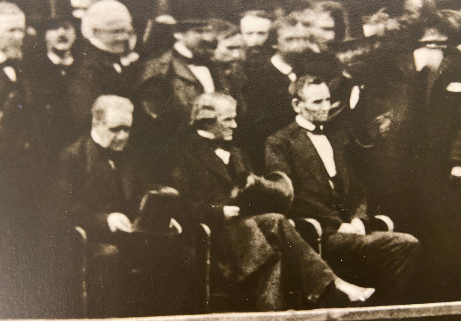 Yet there are a few other images of Lincoln’s second inauguration. Gardner attempted a series of photographs showing Lincoln seated at the front of the platform. The most successful attempt was the following, which shows the President seated next to his Vice Presidents, Andrew Johnson and Hannibal Hamlin.