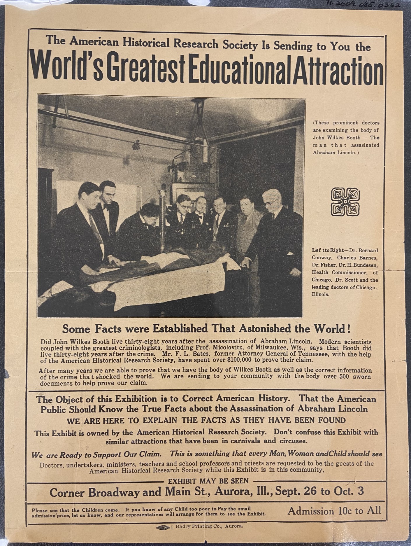 The post-mortem career of drifter David E. George has been the subject of many programs on the so called History Channel and others, but is hardly a new piece of pseudo history. As obliquely referred to on this broadside from the 1930s, it has been claimed that John Wilkes Booth escaped justice in 1865 only to take his own life 38 years later in Enid, Oklahoma. This ad portrays itself as a traveling exhibit of immense educational value that hopes to “correct American history” by showing that Booth had lived. With a name like the American Historical Research Society, I’m sure several people were convinced that they had been presented with the actual mummified remains of the assassin of President Lincoln. However, this advertisement is little more than an ad for snake oil. Despite its claim that one should not, “confuse this Exhibit with similar attractions that have been in carnivals and circuses,” that is exactly was this was. The “Booth” mummy had been traveling with carnivals since the the early 1920s and while it was now a solo attraction that visited towns and cities off the main thoroughfares, it was still little more than a sideshow hustle. The American Historical Research Society was nothing but an imaginary name incorporated by two hucksters of the mummy. They hoped the title would provide some legitimacy to their little sideshow attraction. But a pig is a pig, no matter how much lipstick you put on it! This advertisement for the “Booth” mummy exhibit comes from the collection of the Allen County Public Library in Fort Wayne, Indiana.