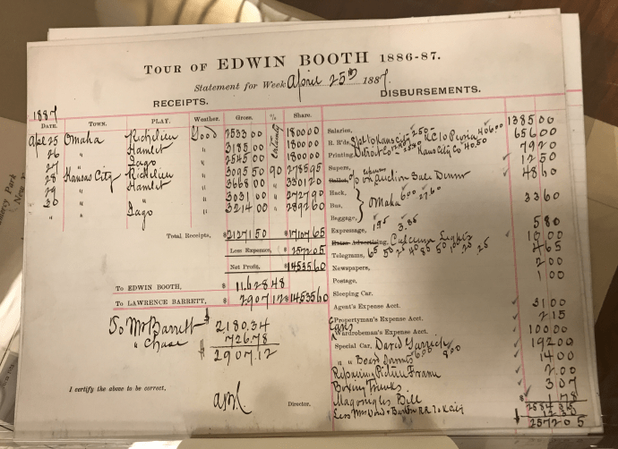 Not every financial record need be as doom and gloom as an assassin’s check. For example, here is a look at the inner workings of a far more celebrated touring star. This is the statement showing all of Edwin Booth’s expenses and income during the week of April 25, 1887. During this period of time, Booth was taking part in what is known as the Booth-Barrett Tours. From 1886 – 1890, Edwin and fellow actor Lawrence Barrett traveled around the country. The pair traveled over 14,000 miles and gave 233 performances. It’s fun to see the details of what the accounting for tours like this looked like. For this week of the tour, we can see what shows were produced and where, the total box office gross, and the amount Booth and Barrett received from their efforts. On the other side we see their expenses which included railroad tickets, the printing of playbills and advertisements, the purchase of calcium lights, telegrams, the expenses of their prop and wardrobe keepers, and even miscellaneous expenses like the repairing of a picture frame for $2. These bookkeeping records rarely survived long past their authors but demonstrate the importance of proper records in order to be successful as a traveling actor. This financial record comes from the Harry Ransom Center in Austin, Texas.