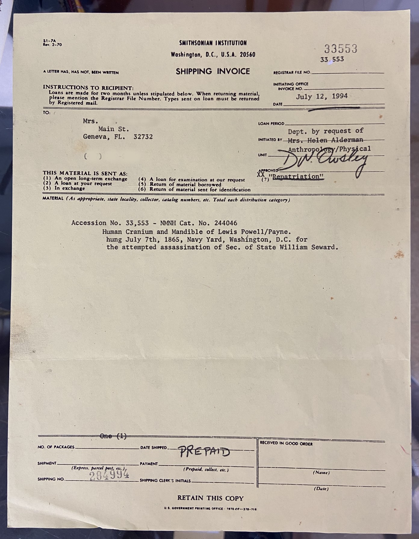 Most of us can’t wait to toss the shipping invoices that accompany our delivered online purchases. Like all receipts, shipping invoices are largely ephemeral, designed to survive the trip to their destinations. But in some cases, especially when it comes to historical artifacts, receipts can be used as a form of provenance to help prove where a specific item came from. In these cases, shipping invoices may become part of a formal record of an item. It’s perhaps not so surprising then that this shipping invoice from the Smithsonian Institution in Washington, D.C. was retained when it accompanied a very unique relic in 1994. As stated on the paperwork, this invoice accompanied the transfer of the, “Human Cranium and Mandible of Lewis Powell/Payne” from the Smithsonian to a descendant of the Powell family living in Geneva, Florida. Noted as a matter of “repatriation”, this document represents the final trip that Secretary of State William Seward’s would-be assassin, Lewis Powell, took after his skull had been rediscovered among the Smithsonian’s anthropology collection in the 1990s. Through the help of historians Michael Kauffman and Betty Ownsbey, descendants of the Powell family took ownership of their ancestor’s remains and laid his skull to rest next to his mother in Geneva Cemetery. For more about Lewis Powell’s post-mortem travels click here. For a video I shot at Geneva Cemetery in 2020, check out this post. This shipping invoice comes from the collection of the Geneva History Museum in Geneva, Florida.