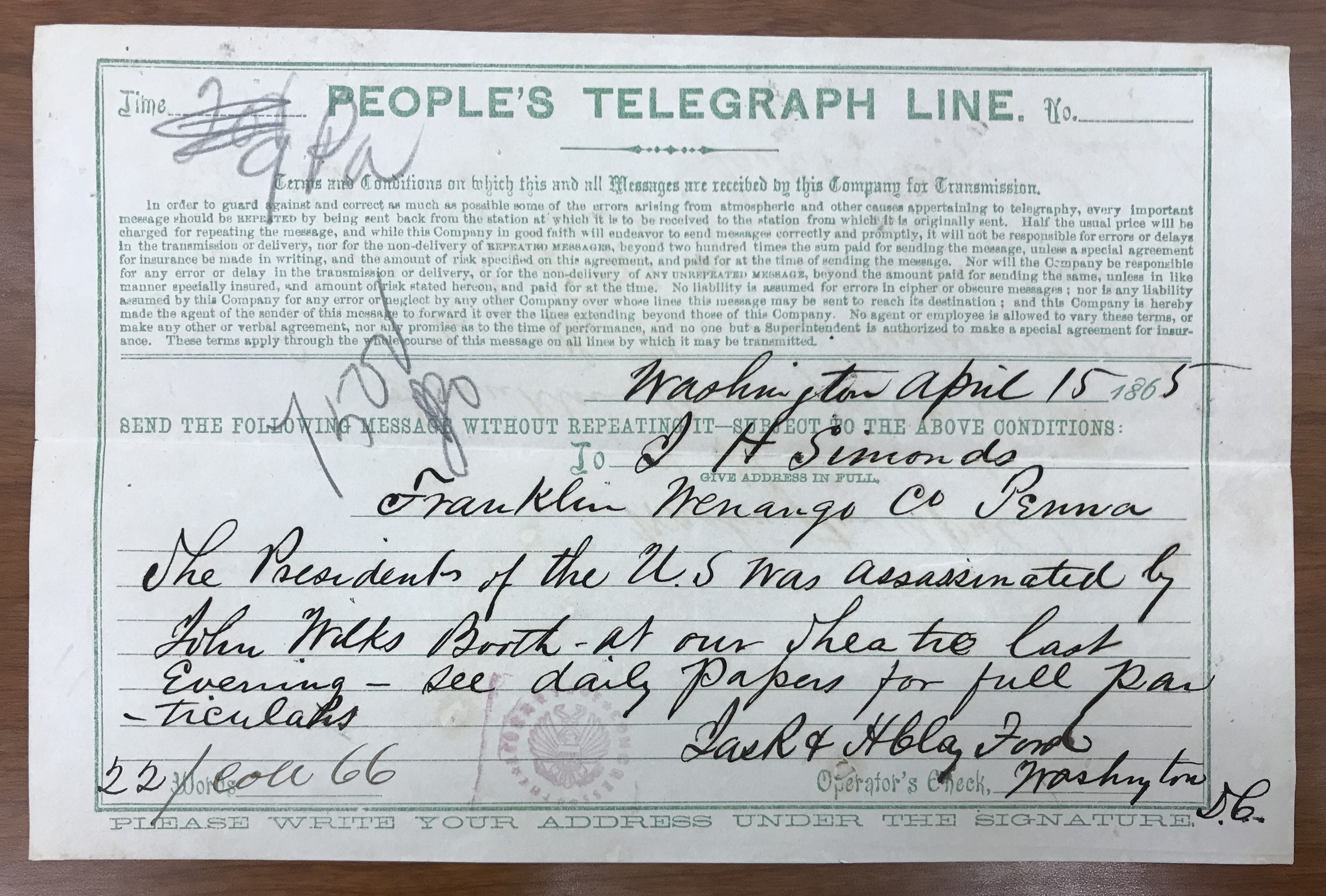 There are many telegrams that are a part of the story of Lincoln’s death. As the main method of rapid communication across distances in the 1860s, John Wilkes Booth and his conspirators often communicated with each other via telegram. However, the telegram above does not come from Booth or any of his conspirators. Rather it was a note sent by two of the Ford brothers from Ford’s Theatre. Harry Clay Ford had been present at his theatre when Booth shot Lincoln. His brother, James Reed “Dick” Ford, had been present earlier in the day and evening, but was away at the moment of the assassination. At some point on April 15, Harry and Dick sent off this telegram stating that, “The President of the U.S. was assassinated by John Wilks [sic] Booth at our theatre last evening – see daily papers for full particulars.” Interestingly, the recipient of this telegram was Joseph Simonds, a friend of John Wilkes Booth’s who acted as his agent in the Pennsylvania oil region. Booth had recruited Simonds, a former banker from Boston, to help him in the oil business in 1864 and even though most of Booth’s investments had ended Simonds had stayed in the oil business. Simonds often sent mail to Booth care of Ford’s Theatre and so the Ford brothers may have felt compelled to alert Simonds of what had occurred as soon as possible. At the trial of the Lincoln conspirators all three men, Dick Ford, Harry Ford, and Joseph Simonds, would be called to testify about their relationship with Booth. This telegram is in the collection of the Library of Congress.