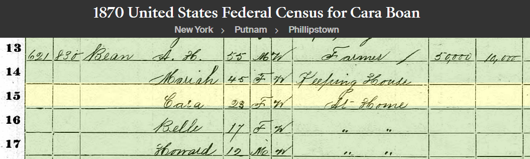 Armed with this information, I quickly found my most promising lead yet in the 1870 census. I found a 23-year-old named Cara Bean living in Phillipstown, NY which was located just across the Hudson River from West Point.
