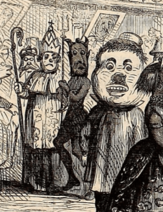 Leckie continues, describing how a few days later on April 5th, Custer and the Bean cousins attended a Bal d’Opera at the Academy of Music. This was a masquerade ball in which Custer dressed up as the devil. Later, he wrote to Libbie noting Thomas Nast had drawn the scene of the ball and that a caricature of his costume was published in Harper’s Weekly. While the drawing doesn’t seem to capture either Cara or Fanny Bean, here apparently is George Armstong Custer as the devil.