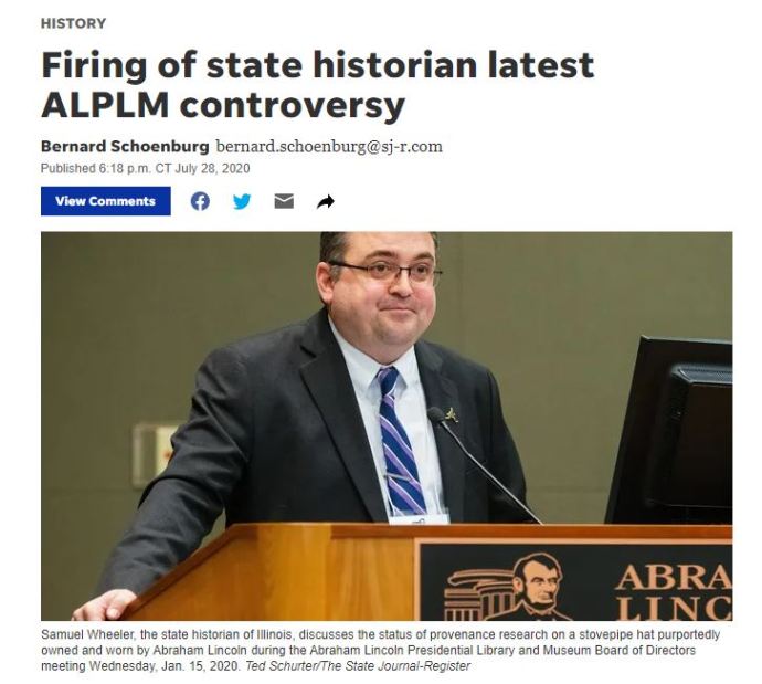 Less than ten days later, on July 15, 2020, Dr. Samuel Wheeler was removed from his position as the Illinois State Historian. Since he served at the will of the Governor, no reason was given for his removal. However, it seems clear that his criticism of ALPLM leadership and his refusal to let his research be used as a weapon in a war between the ALPLM and its partner Foundation led to his removal.