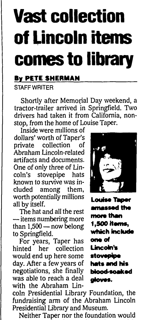 • Louise Taper put the board of the Abraham Lincoln Presidential Library Foundation under a time crunch to purchase her collection in 2006/2007, citing another interested party who had the capital ready to go.
