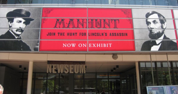 Located on the corner of Pennsylvania Avenue and 6th Street in northwest D.C., the Newseum is an impressive institution devoted to the evolution of news reporting and the importance of free press in a society. The seven floor museum contains impressive permanent exhibits relating to some of the most news worthy events in American and world history. There are also many galleries in the museum which house an array of different temporary exhibits. When I visited Washington, D.C. for the first time in 2009, I made sure to tour the Newseum due to the fact that they were displaying a temporary exhibition based around James Swanson’s book, Manhunt. One of my very first posts on this site recounted that wonderful exhibit.