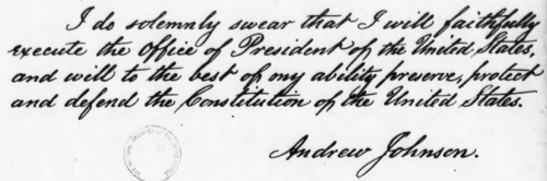 Assistant Judge Advocate John Bingham then presented into evidence a certified copy of the oath of office signed by Andrew Johnson on April 15, 1865, when he ascended to the Presidency upon Lincoln’s death. Bingham also presented a certified copy of the Senate resolution approving the appointment of William Seward to the office of Secretary of State along with a signed commission of the fact by Abraham Lincoln. Both of these documents were entered into evidence without objection.[8] These documents, along with the prior ones regarding the lawful election of Abraham Lincoln, were to legally establish that those targeted for assassination on April 14th were officials of the United States government.