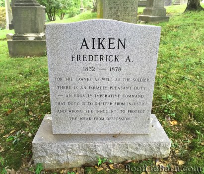 At the conclusion of William Doster’s closing arguments for George Atzerodt, Frederick Aiken addressed the court on behalf of his client, Mary Surratt. Aiken’s closing arguments can be read in full by clicking here or on the image above. He began his statements with, “For the lawyer as well as the soldier, there is an equally pleasant duty – an equally imperative command. That duty is to shelter from injustice and wrong the innocent, to protect the weak from oppression, and to rally at all times and on all occasions, when necessity demands it, to the special defense of those whom nature, custom, or circumstance may have placed in dependence upon our strength, honor and cherishing regard.” A truncated version of this opening statement was carved into Aiken’s headstone when his previously unmarked grave was marked in 2012.