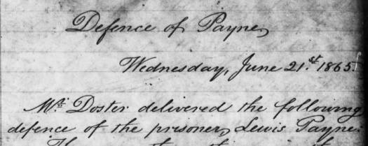 “The Commission met at twelve and heard Mr. Doster’s defense of Payne & Atzerodt. It was rather a remarkable defense. The deeds charged were not denied except in the case of the letter of the conspiracy to capture was admitted but not to murder or assassinate. Mrs. Surratt’s council Mr Aikin, made his argument which was flowery enough but neither legal or logical in the argument. The court adjourned over until Friday to give Mr. Ewing time to make his defense of Dr. Mud.”[9]
