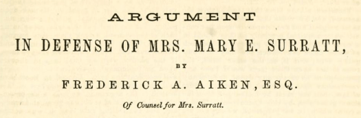 “The arguments of the counsel for each of the accused are generally conceded to possess much legal and literary ability. That of Mr. Aiken today was listened to by a dense auditory, and the appeal in behalf of his client (Mrs. Surratt) was more than ordinarily eloquent and touching.”[12]