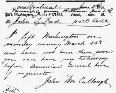Before calling the next physical witness, Thomas Ewing presented a telegram written by the actor John McCullough requesting that it be entered into evidence as if it had been testified to by McCullough personally. McCullough’s telegram, written to John T. Ford, stated that the actor had left D.C. on March 26th and that he had not been back into the city since. The telegram was accepted as both evidence and testimony.[27] The purpose of this note was the counter the testimony of Louis Weichmann who claimed that he had been sent to Booth’s room by Mrs. Surratt on April 2nd and that he saw John McCullough there.