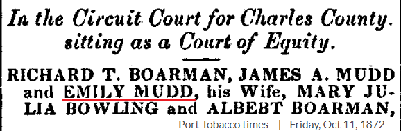 Emily [Boarman] Mudd, Dr. Mudd’s sister-in-law, largely reiterated the testimony of Fannie Mudd regarding the movements of Dr. Mudd during the first few days of March. She recalled how Dr. Mudd tended to his sick sister from March 2nd – 5th. Emily also denied having seen any men about Dr. Mudd’s farm since 1861. Emily also stated that she saw Dr. Mudd riding back from Bryantown on the day after Lincoln’s assassination. She stated the doctor was riding alone at that time. When the prosecution cross-examined, Emily they asked her if she saw her brother-in-law riding towards Bryantown earlier in the day. She stated that she did. For some strange reason, the prosecution failed to ask Emily whether the doctor was alone during his ride towards Bryantown. Given that several of the prosecution’s witnesses testified that David Herold accompanied Dr. Mudd to Bryantown, this is a strange omission on the part of the prosecution.[12]