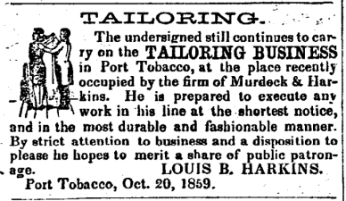 Louis B. Harkins, a tailor in Port Tobacco, Maryland, was called as a defense witness for George Atzerodt. Harkins recounted that he had known Atzerodt for about ten years. Doster asked Harkins if Atzerodt had been in Port Tobacco at the end of February or beginning of March. Harkins stated he did see Atzerodt for a day or two around that time, but that he could not fix the date. When asked about Atzerodt’s reputation in the community, Harkins stated that Atzerodt was a good natured fellow but that no one gave him much credit for courage.[12]