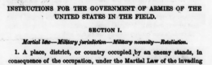 Judge Advocate Holt then offered into evidence General Orders No. 100 dated April 24, 1863. These orders from the Adjutant General’s office were “instructions for the government of the armies of the United States in the field.” The 26 page document dealt with all matters of war and conduct including martial law, spies, and military commissions.