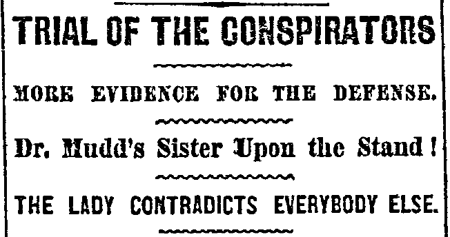 Mary A. Nelson, one of David Herold’s sisters, was likewise called as a defense witness for Dr. Mudd. Nelson reiterated that she had never heard her brother mention the name of Dr. Mudd and that Mudd was completely unknown to the family until his arrest.[16] The point of the two Herold sisters’ testimonies was to establish that there had been no prior connection between David Herold and Dr. Mudd.