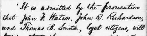 Thomas Ewing, lawyer for Dr. Mudd, then presented an agreement to the court that had been agreed to by the Judge Advocate General. The agreement consisted of a statement informing the court that loyal witnesses consisting of John F. Watson, John R. Richardson, and Thomas B. Smith would each testify that prosecution witness Daniel Thomas had a poor reputation in his community and that they would not believe him under oath. In addition, John R. Richardson would further testify in support of the series of events testified to by William Watson, in relation to Daniel Thomas appeal for reward money if Dr. Mudd was convicted. The prosecution agreed to allow this statement of facts be put onto the record in lieu of each one of these witnesses actually taking the stand to testify in person. The court agreed to weigh this statement in the same manner as if the men had spoken about it in open court.[28]