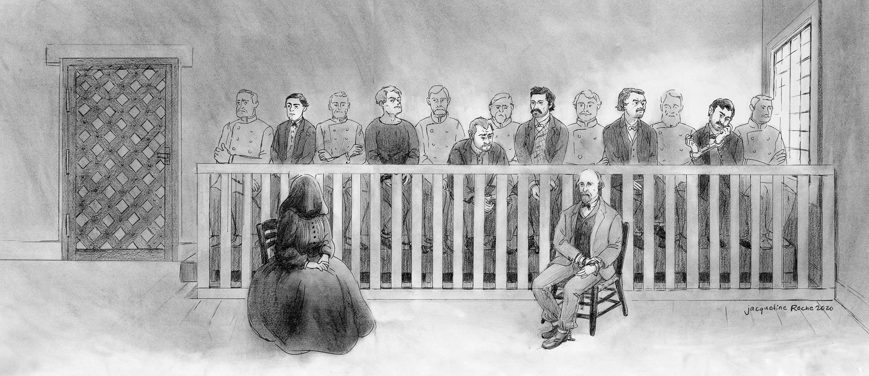 At 11:45 am, the conspirators were brought into the courtroom, this time having had the hoods they were forced to wear while in their cells removed before entering. The conspirators were seated in the same places as the previous day. The conspirators placed on the prisoners’ dock were accompanied by Army soldiers who were placed on both sides of them as guards. All of the male conspirators, except Dr. Mudd, wore rigid, Lilly iron handcuffs. Dr. Mudd wore traditional chain handcuffs. All of the conspirators, including Mrs. Surratt, wore chains on their ankles with some being attached to iron balls. The illustration below shows the way the conspirators were seated on this date and the day before. It was created by the talented artist and historian, Jackie Roche. Please click the image for more detail.
