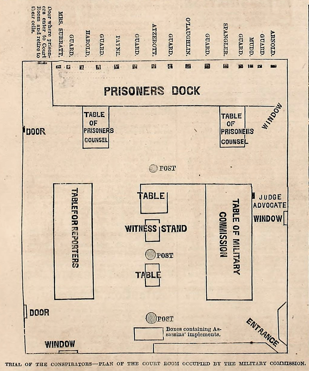 3. You are correct that the diagram is mistaken as to the exact layout of the prisoner’s dock in the courtroom. During these early days of the trial the dock was not long enough for everyone. However, some construction work was done on the dock in the evening of May 15th and it was extended across the length of the room. When that happened, Mary was seated at the far left end, separated by the other conspirators by a guard seated in front of the grated door. You will see this change as we go along. Regardless, the diagram I included from Frank Leslie’s Illustrated Newspaper is inaccurate in regards to the prisoner’s dock, yet fairly accurate in all other respects.