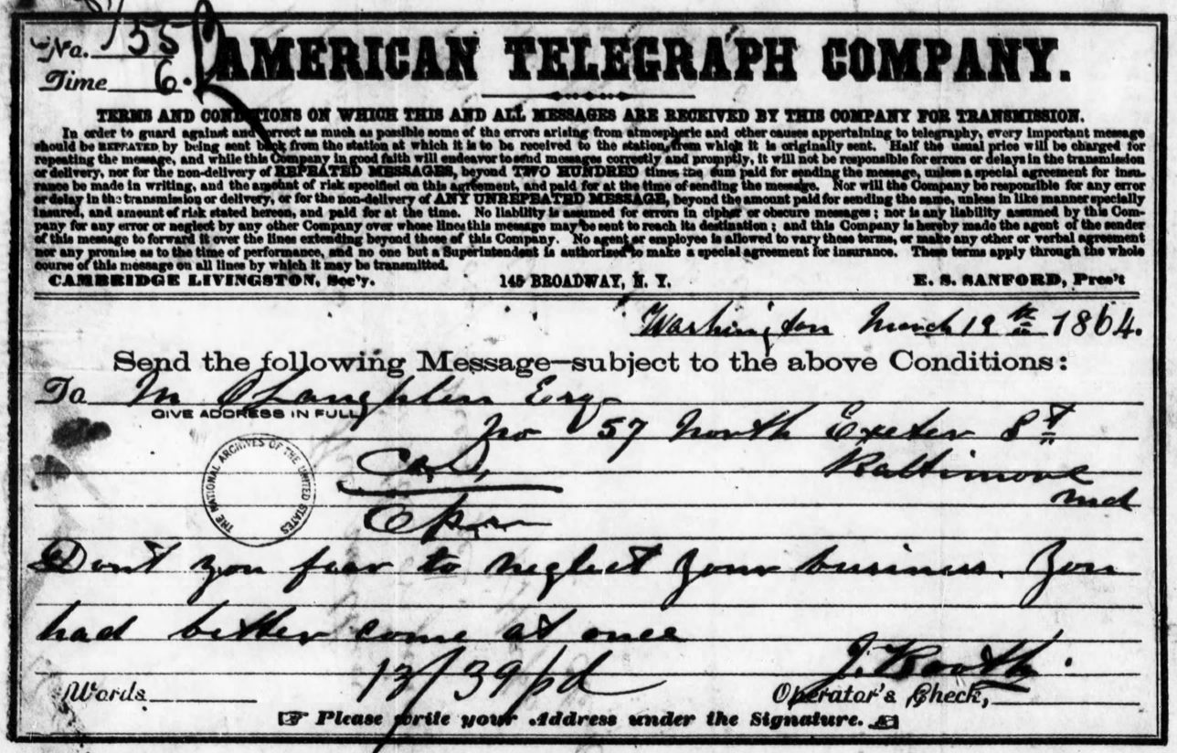 John Happ, a D.C. telegraph clerk, testified about having transmitted a telegram for John Wilkes Booth on March 13, 1865. The telegram was addressed to Michael O’Laughlen in Baltimore and ordered him to come to Washington at once.[33]