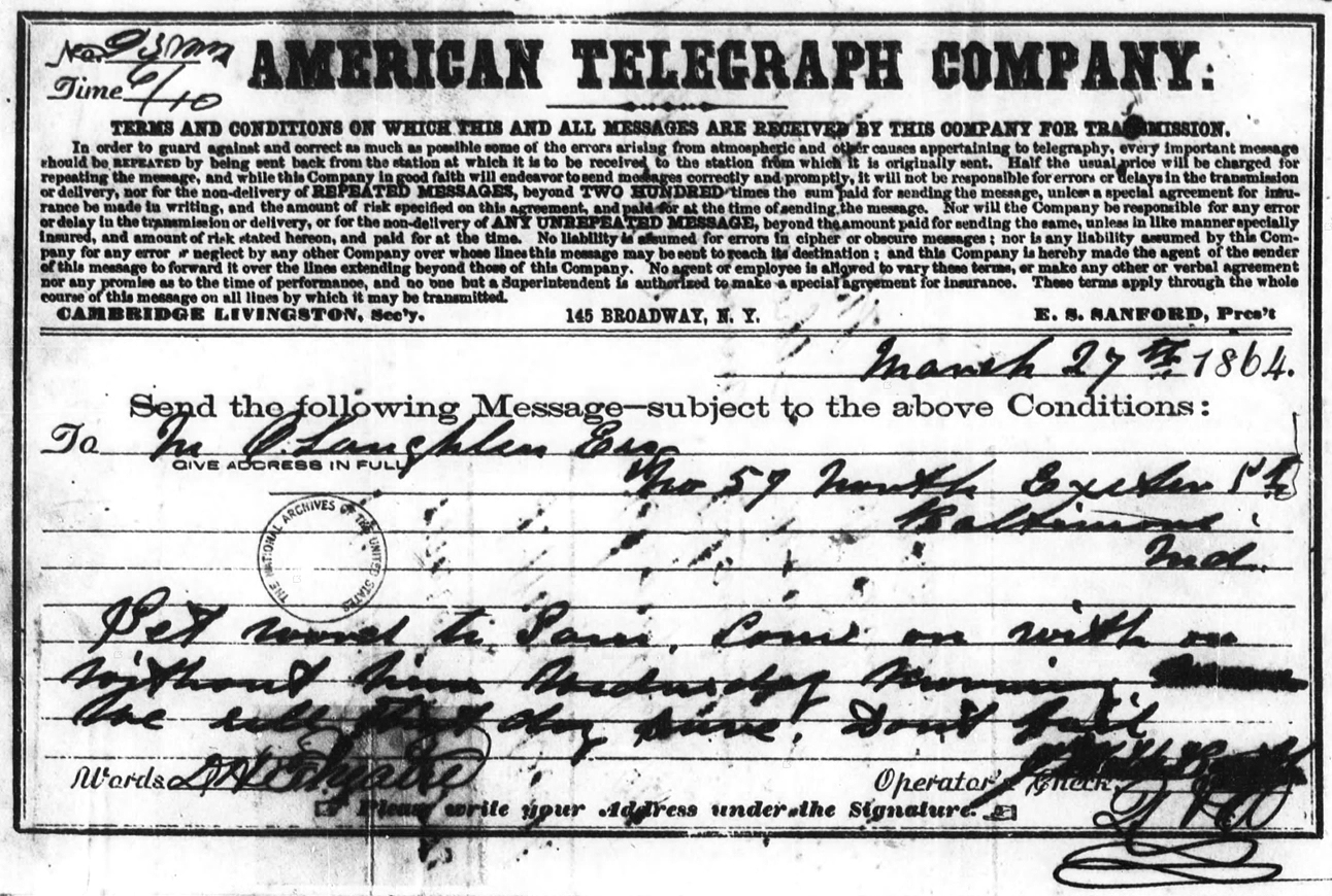 This telegram, sent by John Wilkes Booth to Michael O’Laughlen on March 27, 1865, was entered into evidence as Exhibit 46.