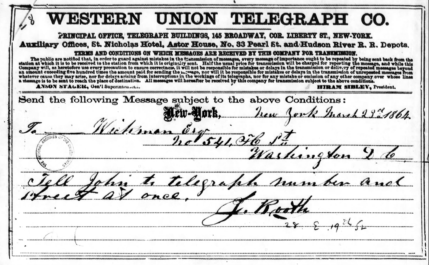 Edward C. Stewart, a telegraph operator at the Metropolitan Hotel in D.C., testified about having transmitted a telegram for John Wilkes Booth on March 27, 1865. This telegram was also addressed to Michael O’Laughlen in Baltimore and told O’Laughlen to “get word to Sam” and to come to Washington “with or without him” in two days.[34]