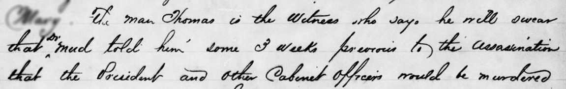 Daniel J. Thomas, a resident of Charles County, testified that in March of 1865 he was at a neighbor’s home with Dr. Samuel Mudd. According to Thomas, after some discussion about the war seeming to come to a close soon, Dr. Mudd made a remark that the South would never be subjugated under the abolitionist doctrine of Lincoln and his cabinet and that they, and all Union men in Maryland, would be killed in six or seven weeks. A significant amount of cross examination occurred on the part of the Frederick Stone and Thomas Ewing, Dr. Mudd’s lawyers. Thomas stated that he told at least two named individuals about Dr. Mudd’s words before the assassination and that he had written a letter to the provost marshal of the region about it but had received no reply. Thomas’ testimony was a bit disjointed with the witness stating that Dr. Mudd said the words both in seriousness and in a laughing manner. Thomas also conflictingly stated that he thought Dr. Mudd was joking, and yet still apparently felt compelled to write to the provost marshal.[32] Later in the trial, Dr. Mudd’s defense would produce a multitude of witnesses to speak to Thomas’ unreliability and effectively prove Thomas’ recollections to be untrustworthy.