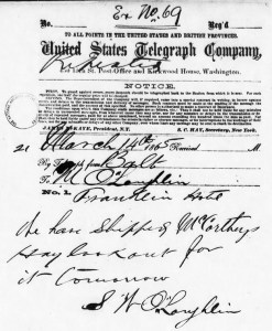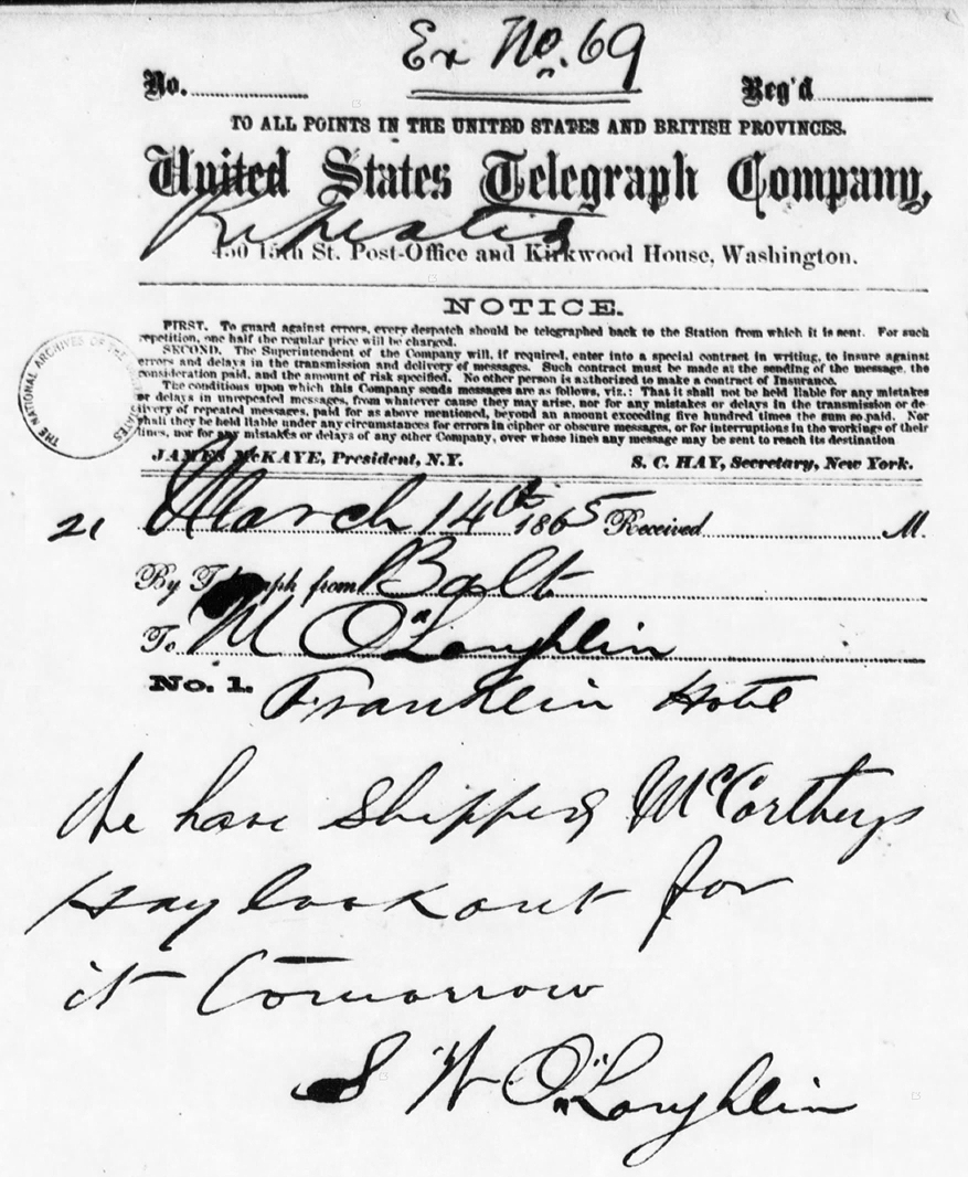 The telegram sent by Samuel Williams O’Laughlen to his brother Michael on March 14, 1865 was entered into evidence as Exhibit 69.