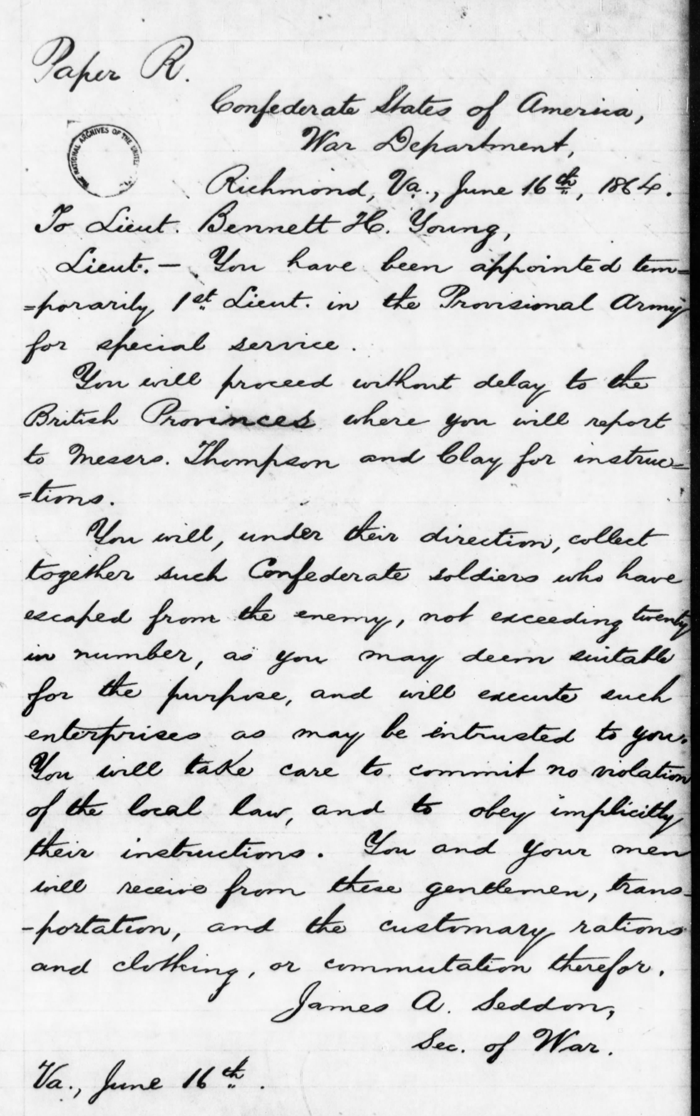 A copy of the Confederate military commission of Bennett Young, a member of the St. Albans raiders, was entered into evidence as Exhibit 71.