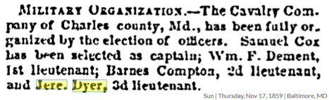 Jeremiah Dyer, a former resident of Charles County and Dr. Mudd’s brother-in-law, testified about having known Dr. Mudd since the two were children. Thomas Ewing, Dr. Mudd’s lawyer, asked whether Dyer had ever had any conversations with Dr. Mudd regarding sending some of the doctor’s slaves south to the Confederacy. Dyer denied ever speaking with Dr. Mudd about the subject. Dyer also testified that he had never seen John Surratt in the vicinity of the Mudd farm. Ewing then asked Dyer about the incident of him and the Gwynn brothers hiding out in the pines around the Mudd farm. Dyer reiterated the testimony of Bennett Gwynn in saying that this event occurred in September of 1861 and not in 1864. Asked about the reputation of Daniel Thomas, Dyer stated that the public opinion in the region was that Thomas was not to be trusted. During cross-examination, the Judge Advocate questioned Dyer’s own loyalty, getting Dyer to admit that his sympathies were “with the rebels” during parts of the war.[12]