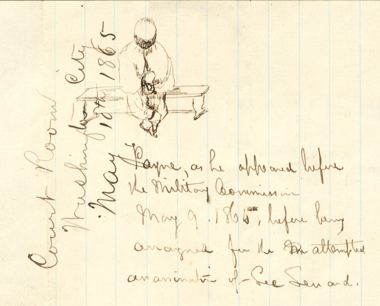 At some later date, Gen. Wallace expanded on his sketch and created this full drawing of how Samuel Arnold appeared during this arraignment.