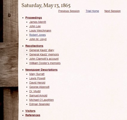 I have attempted to make this project as interactive as possible. Starting with May 9th, the day in which the proceedings of the trial actually began, each individual page contains a Table of Contents at the top. Using this you can click to jump down to a specific witness or conspirator. Clicking entries on the Table of Contents will also provide you with direct links to those places in the page, making it helpful if you want bookmark or share a specific testimony rather than the whole page. When reading my summarized version of a witness’s testimony, the full name of the witness is always hyperlinked. Clicking on their name will take you to their full testimony in the historical transcripts so that you can read them for yourself. In addition, when witnesses are recalled or make direct reference to the prior testimony of others, I have included hyperlinks to the corresponding testimony in question. In this way you can quickly review and/or cross reference the sometimes contrary statements being made.