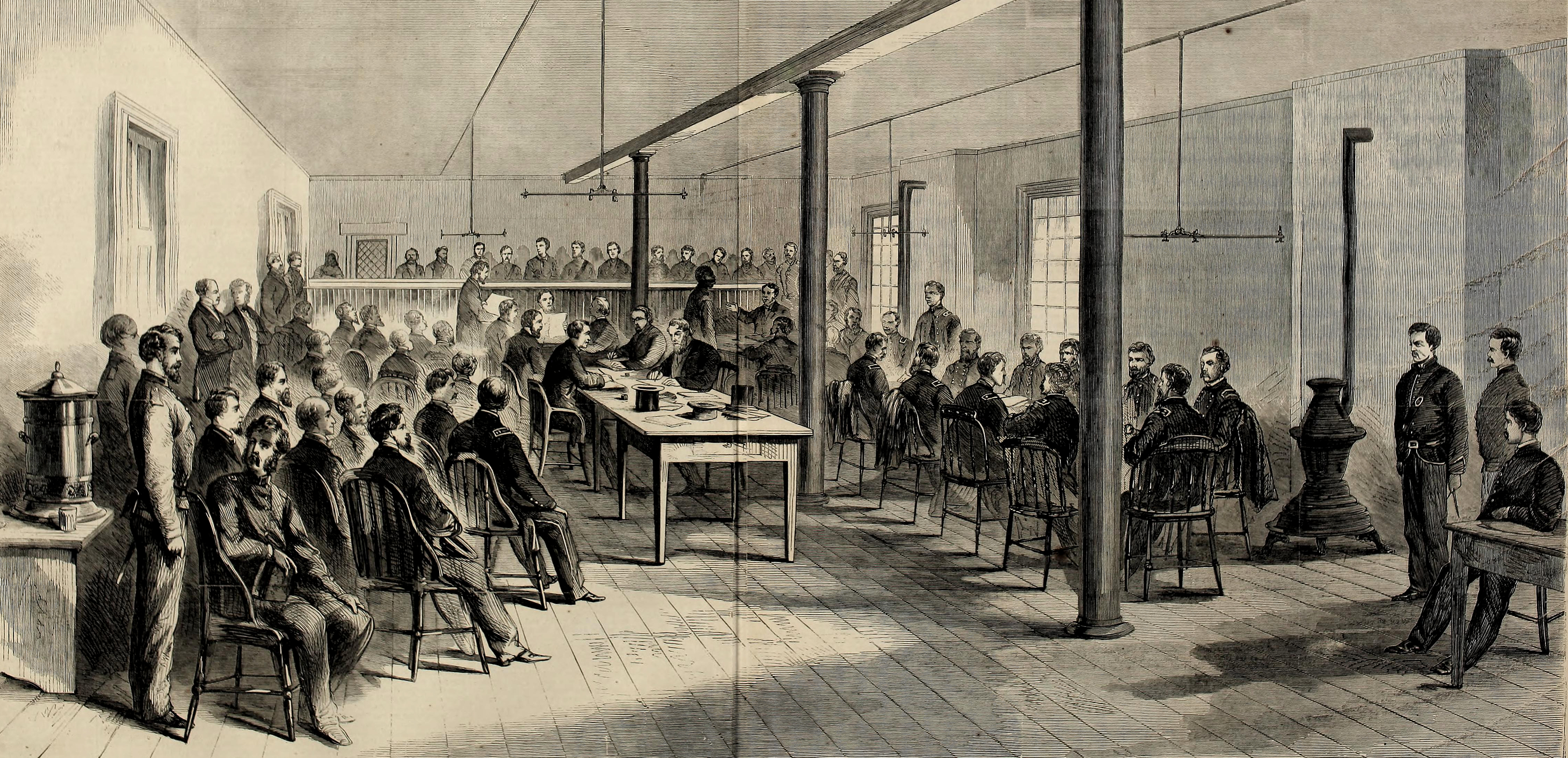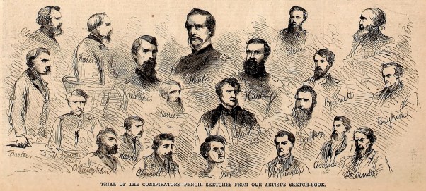 At the beginning of the trial, the court was held in closed session. Public and private uproar over the secrecy of the court caused the doors to be opened up to outside press and visitors starting on May 13th. Starting on this date, the Table of Contents grows to include the newspaper descriptions of the conspirators and known visitors to the court room. As the trial goes on and interest in the individual conspirators’ appearances wanes, there are less descriptions available. Near the latter part of the trial an attempt has been made to supplement these areas with general descriptions of the conspirators from undated sources.